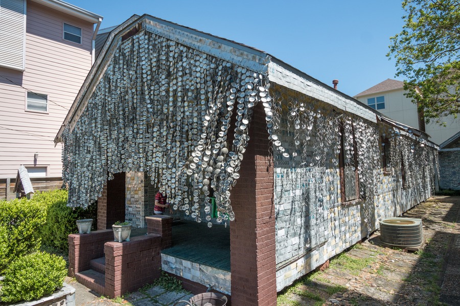 In 1968, retired upholsterer John Milkovisch began transforming his home by covering it with thousands of marbles, rocks, and eventually flattened beer cans. Over 18 years, he continued adding aluminium cans to the exterior, creating both an eye-catching design and an energy-efficient home. It is creative, quirky, and completely unforgettable.