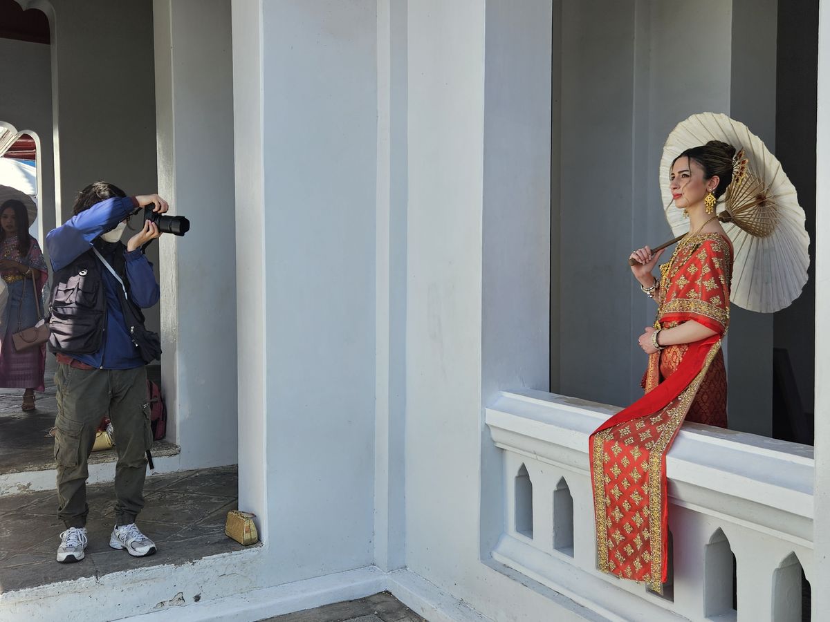 He guided us through poses. Adjusted angles. Worked fast. In just over an hour, we had everything we needed. Stunning Bangkok temple photoshoot images without melting in the sun.