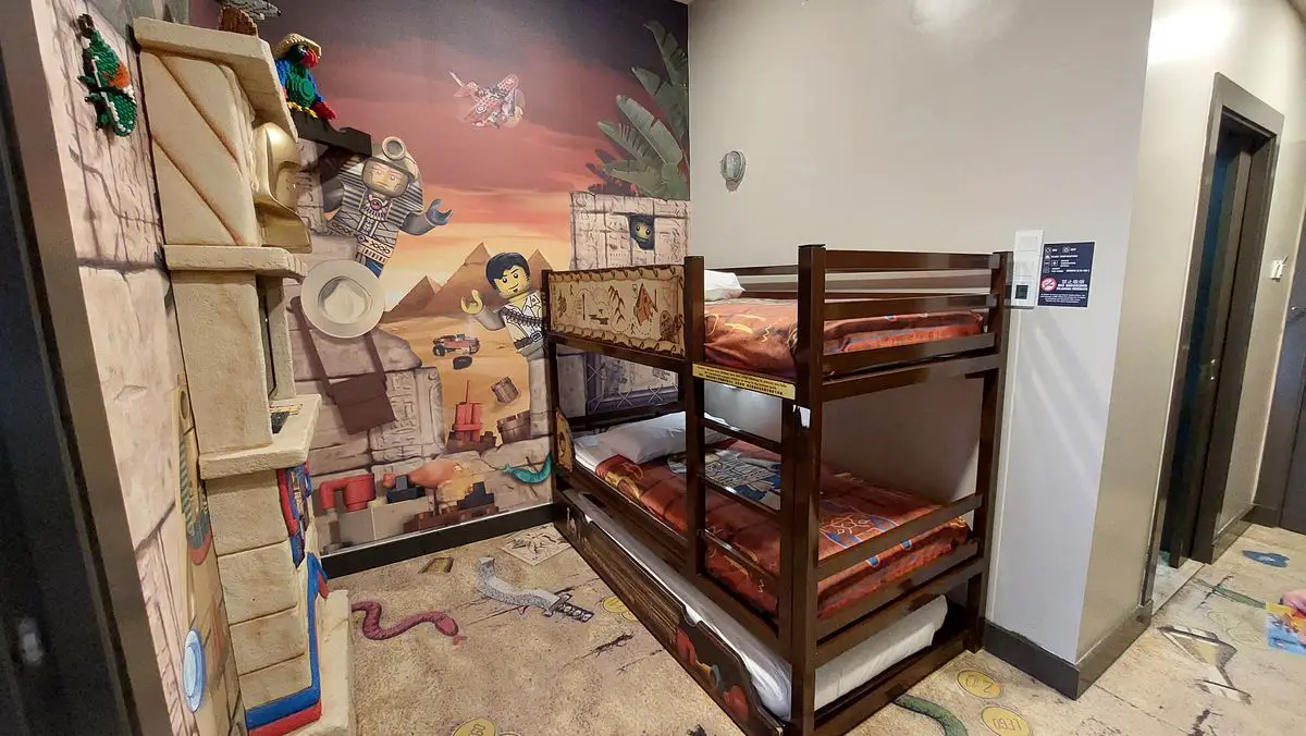 We stayed in the LEGOLAND Adventure Room, which was Indiana Jones style. Rooms include 2 separate sleeping areas; with a king-sized bed for adults and a separate area for up to 3 children, complete with a bunk bed, pull-out trundle bed, and their very own TV.