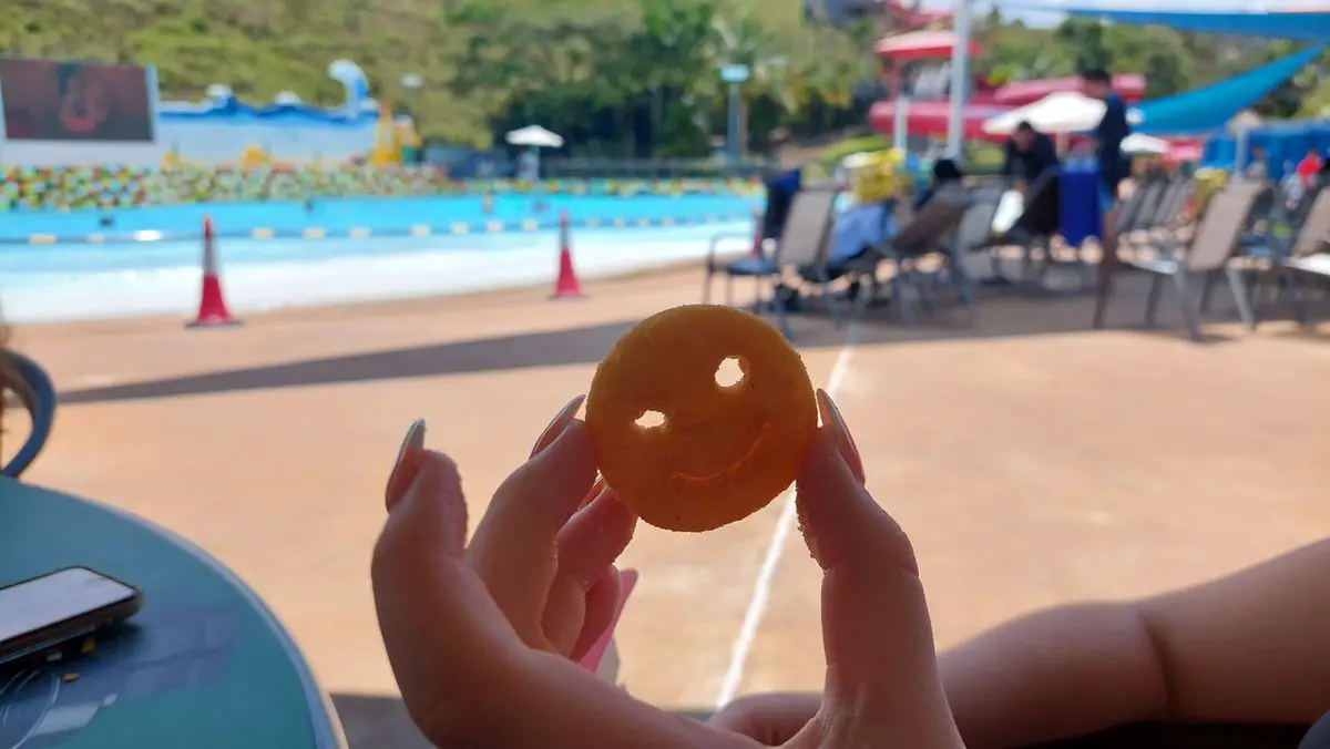 The food on offer is typical fast food nuggets, fries, etc. The lockers weren’t using credit cards while we were there, but we had no problems leaving our stuff on the lounge chairs.