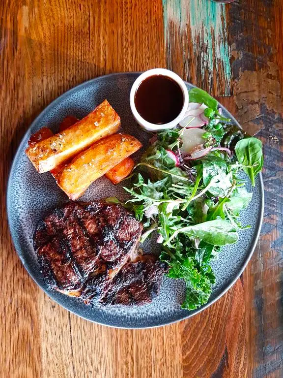 A robust wood cabin with a large toasty fire offering good, hearty meals. Must try the duck risotto for dinner.